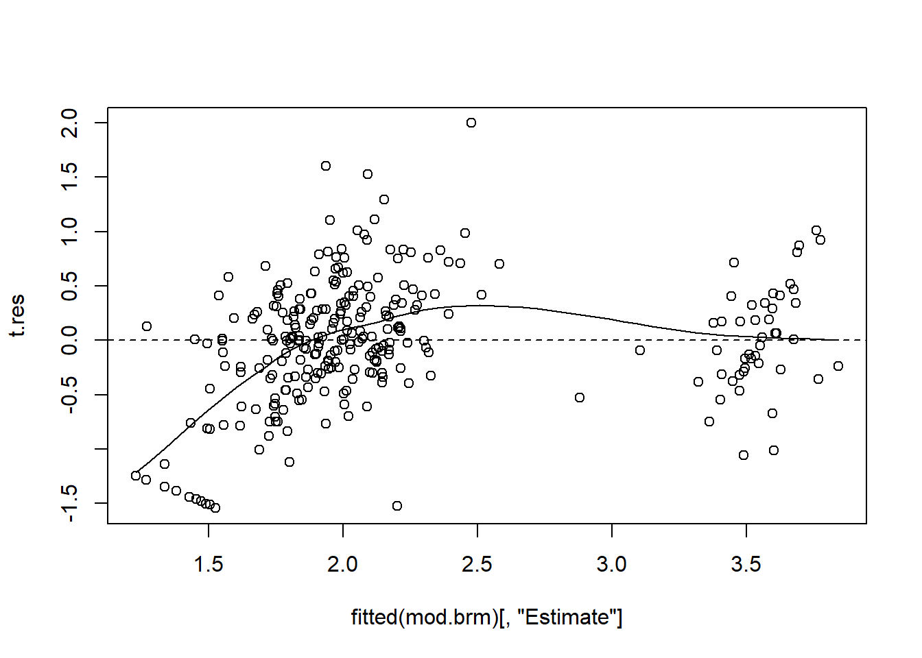 Neither the model output shown above nor the summary function (not shown) give any information about the proportion of variance explained by the model such as an \(R^2\). The reason is that it is not straightforward to obtain a measure of model fit in a mixed model, and different definitions of \(R^2\) exist (Nakagawa and Schielzeth 2013). Check out the function r.squaredGLMM from package MuMIn to get pseudo-\(R^2\) for mixed models.